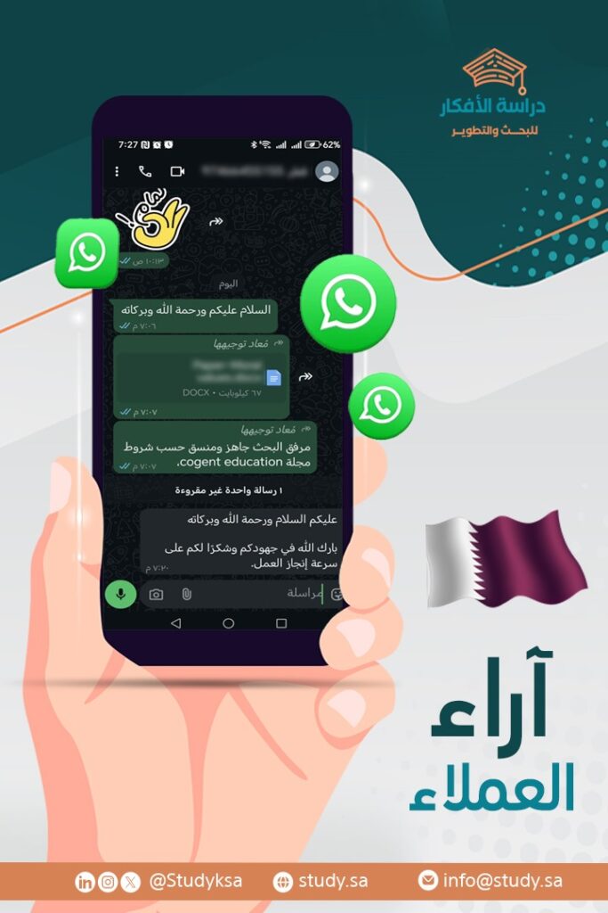 في “دراسة الأفكار”، نفتخر بأننا نكسب ثقة الباحثين من أول تعامل. آراء عملائنا تعكس مدى التزامنا بالدقة الأكاديمية، والاهتمام بأدق التفاصيل، والاحترافية في تقديم خدماتنا. كثير من الباحثين وصفوا تجربتهم معنا بأنها “مريحة، سريعة، ومثمرة”، حيث وجدوا في فريقنا الأكاديمي دعمًا حقيقيًا يواكب متطلبات جامعاتهم ويقدّم حلولًا مخصصة لكل تخصص.
